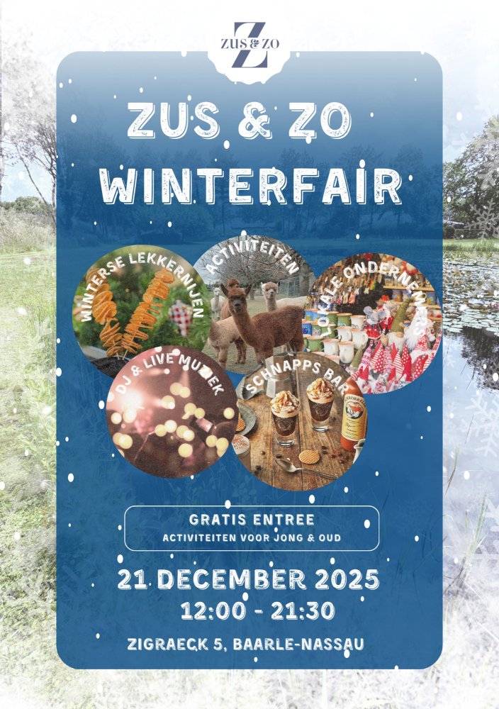 Geniet op 21 december van de Winterfair bij Zus & Zo Borrels en Bites. Voor jong en oud is er de hele dag van alles te doen: